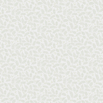 Tapete mit zartgrünem Blattmuster auf hellgrauem Hintergrund.