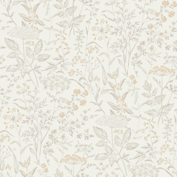 Tapete mit Vintage-Muster aus Wiesenblumen und Gräsern in Beigetönen.