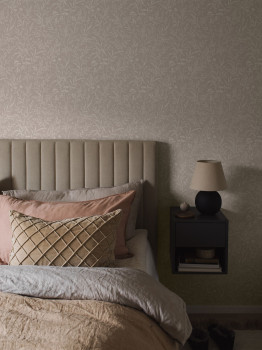 Tapete mit Muster aus Wiesenblumen und Gräsern in Grau- und Graubrauntönen.