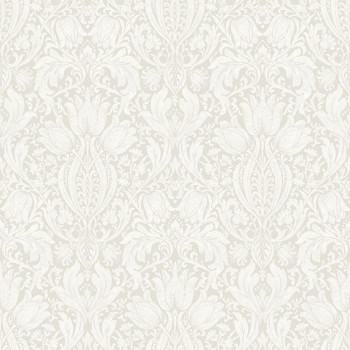 Tapete mit ornamentalen Blumenmuster mit Tulpen und Blättern in neutralen Beigetönen.