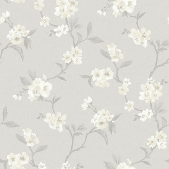 Tapete mit grauem Hintergrund und Muster blühender Kirschzweige.
