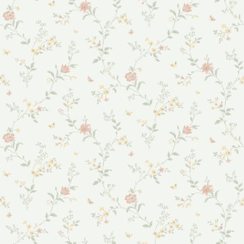 Tapete mit naturweißem Hintergrund, romantisches Blumenmuster in gedecktem Grün, Rosa und Gelb.