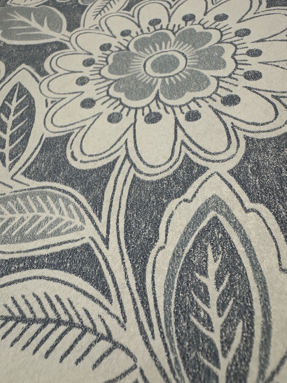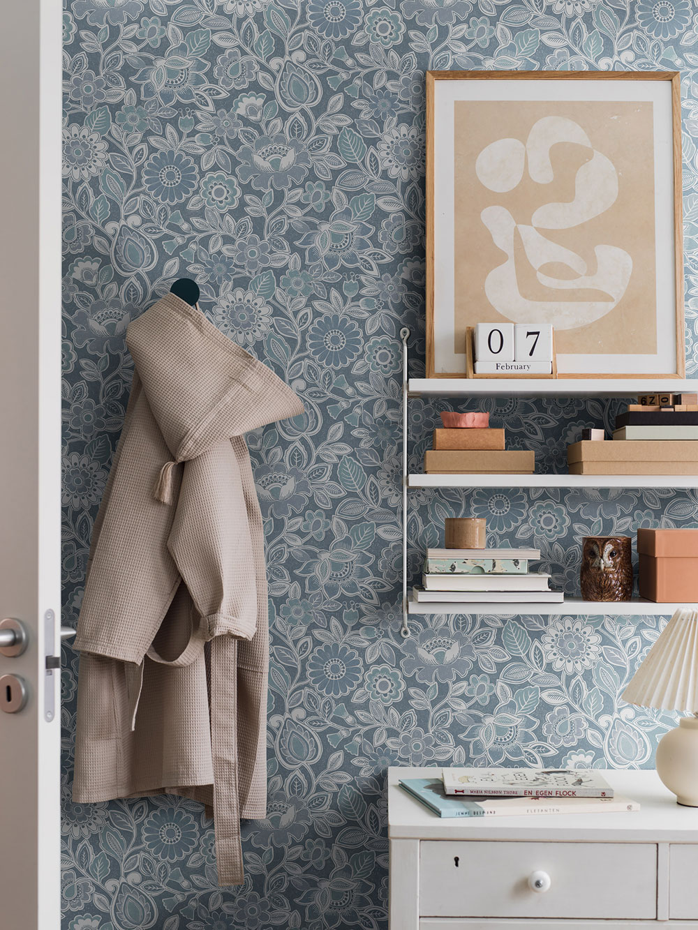 Tapete mit Blumenmuster mit Retro-Touch in Blautönen.