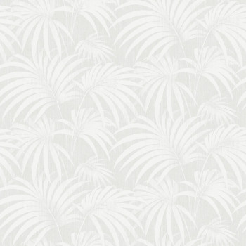 Tapete mit Palmenblattmuster in gedeckten Grautönen.