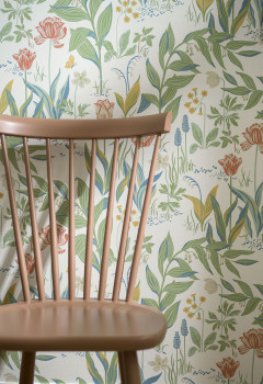 Vliestapete mit Frühlingsblumen und kleinen Schnecken in Grün-, Blau-, Gelb- und hellen Terrakottatönen auf weißem Hintergrund.