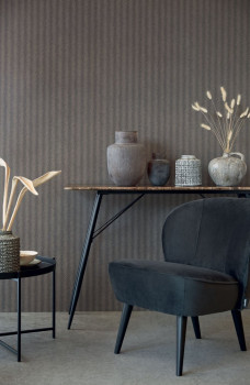 Vliestapete. Zart geprägte Textur, dunkle Brauntöne, abwechselnd matt und dezent halbglänzend.