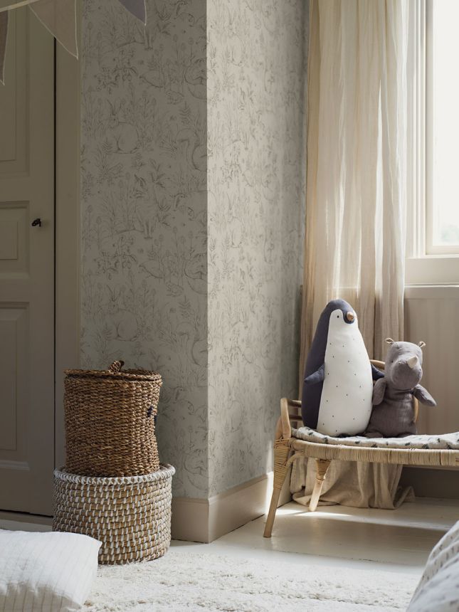 Kindertapete mit grau-beigem Hintergrund und grauen Umrissen von Waldbewohnern und Pflanzen.