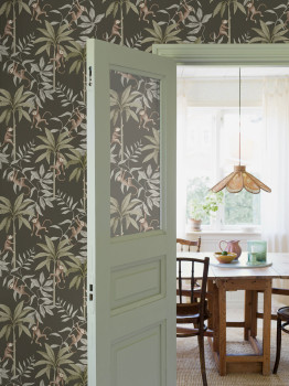 Tapete mit einem braun-schwarzen Hintergrund und Dschungel-Affenmotiven in grünen und braunen Tönen.