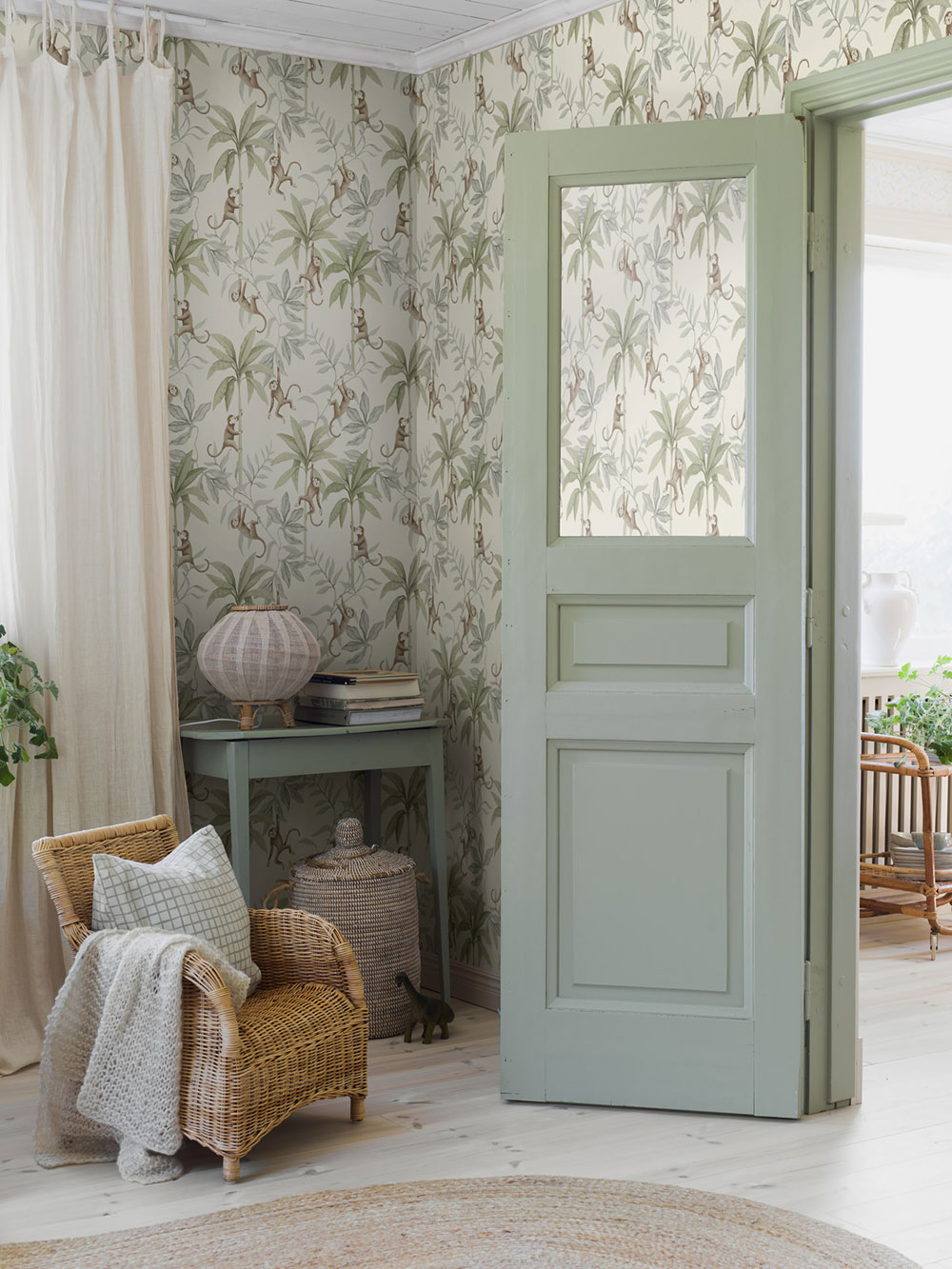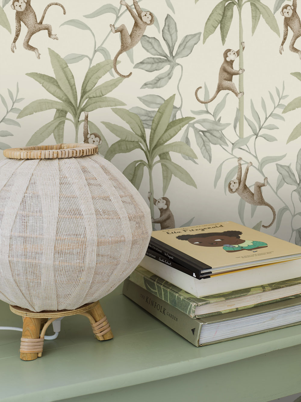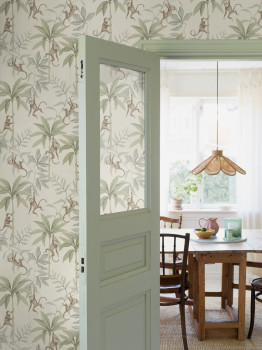 Tapete mit einem weißen Hintergrund und Dschungel-Affenmotiven in grünen, grauen und braunen Tönen.