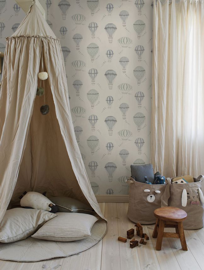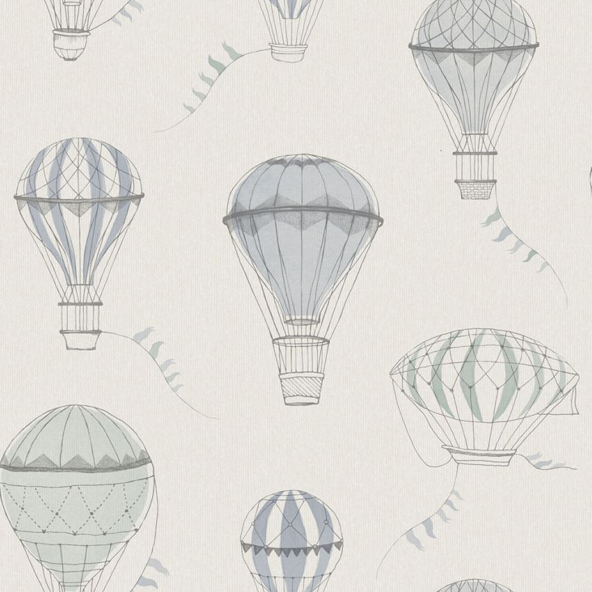 Tapete mit Heißluftballons in grauen, pastellblauen und grünen Tönen auf einem gestreiften Hintergrund.