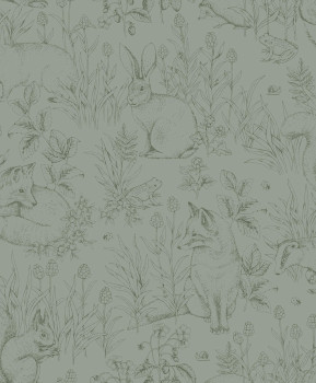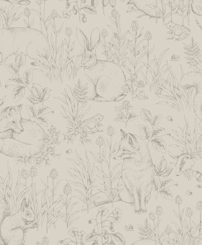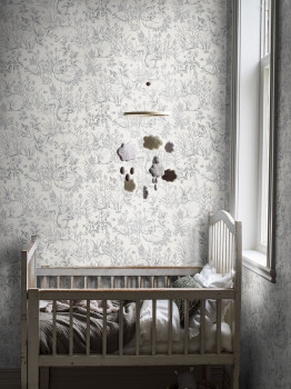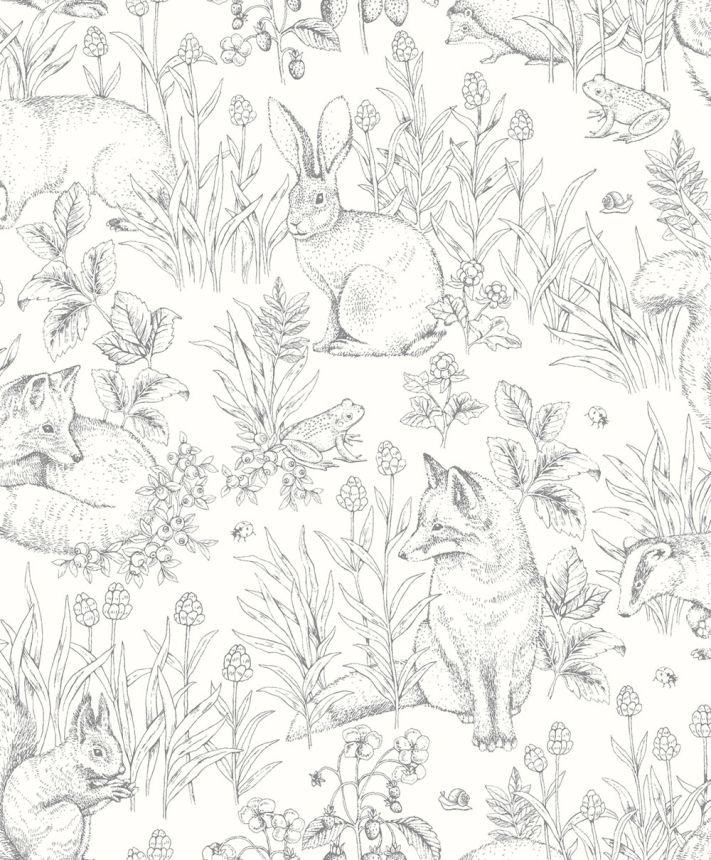 Wandtapete mit weißem Hintergrund und schwarzen Umrissen von Waldtieren und Pflanzen.
