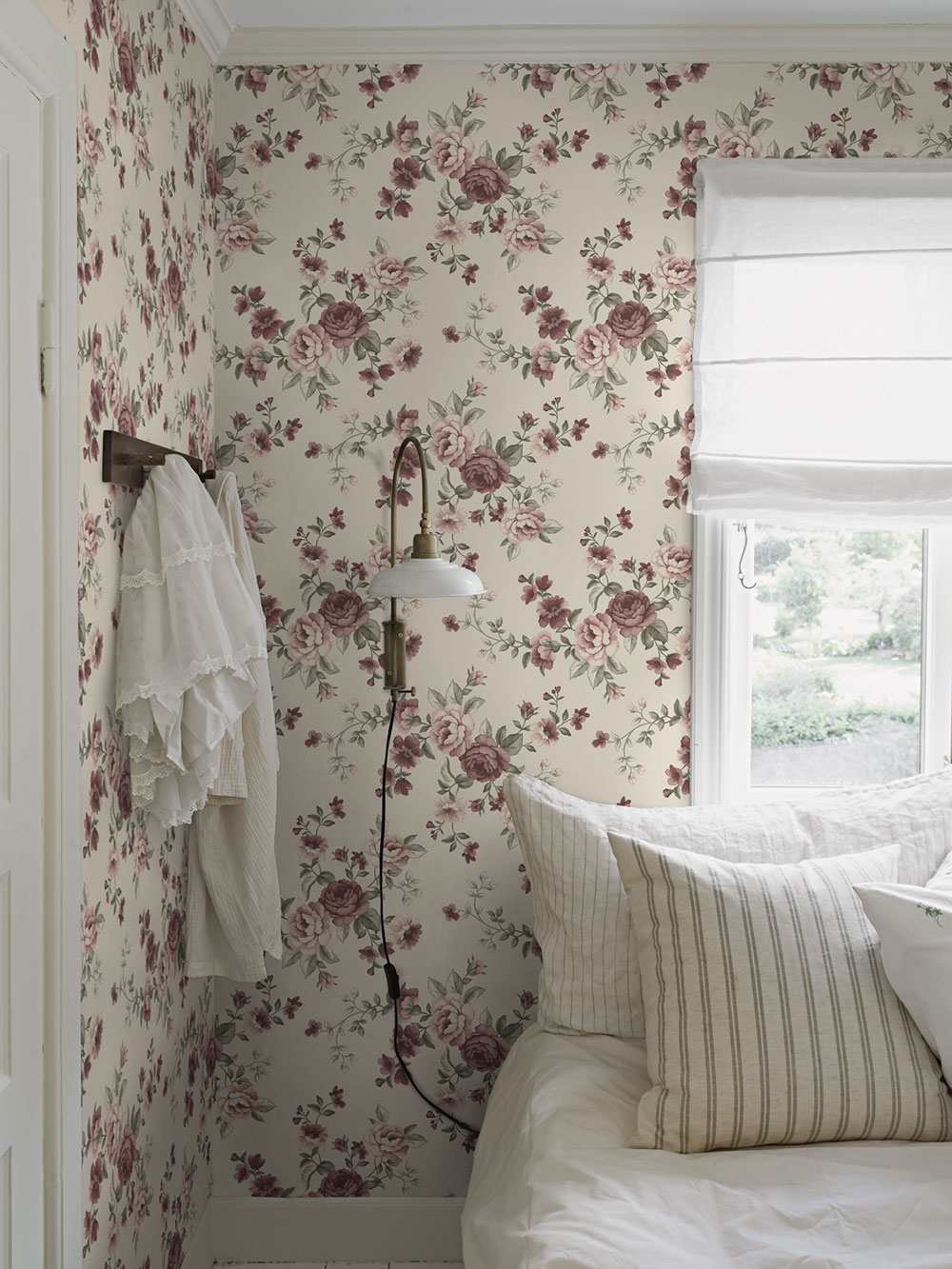 Wandtapete mit einem cremefarbenen Hintergrund und Rosenmotiven in den Farben Grün, Burgunderrot und Rosa.