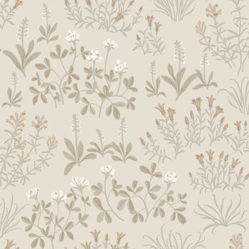 Tapete, heller beige-grauer Hintergrund, Wiesenblumen in Grau-, Beige-, Puderrosa- und Weißtönen.