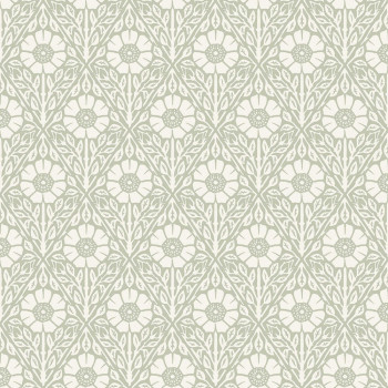Tapete, gedämpft grüner Hintergrund, Motiv mit Hagebuttenrosen im Rautenmuster.