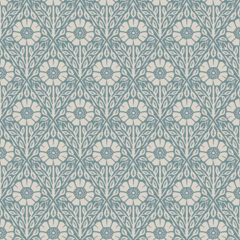 Tapete, blauer Hintergrund, Motiv mit Hagebuttenrosen im Rautenmuster.