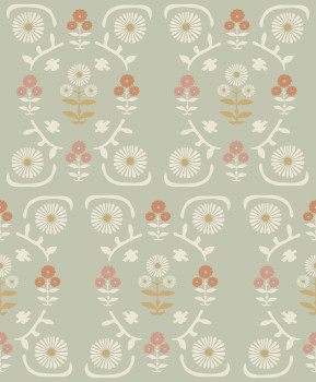 Tapete, gedämpft grüner Hintergrund, Blumenmuster in Braun-, Rosa- und Weißtönen.