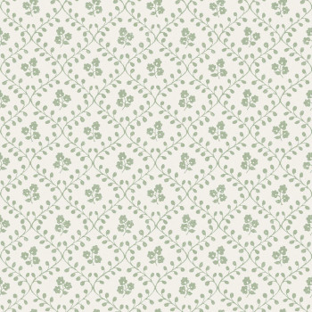 Tapete, ornamentales Blumenmotiv inspiriert von traditionellen Stickereien, cremeweiße und grüne Töne.