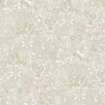 Tapete, beige-grauer Hintergrund, Blumenmotiv in Creme- und Beigetönen.