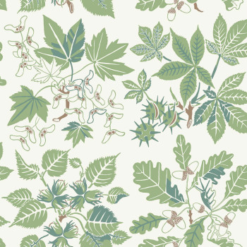Tapete, cremeweißer Hintergrund, Motiv von Zweigen von Ahorn, Hasel, Kastanie und Eiche in Grün- und Brauntönen.