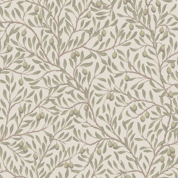 Tapete mit hellem grau-beigem Hintergrund, Olivenbaum-Motiv mit reifen Früchten.