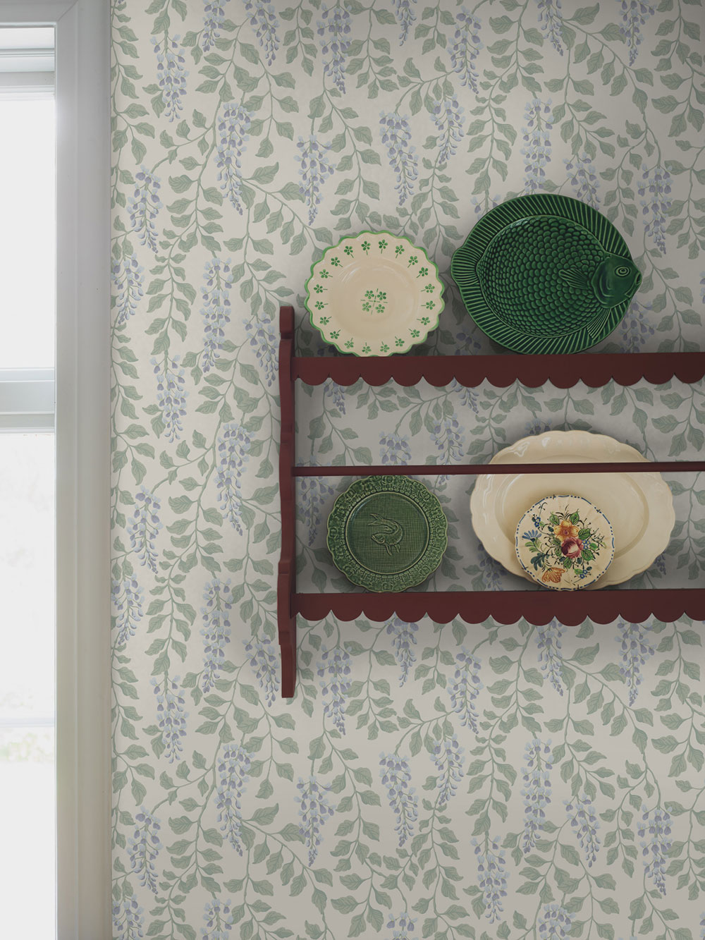 Tapete mit cremefarbenem Hintergrund, blühendes Glyzinien-Motiv in Violett- und Grüntönen.