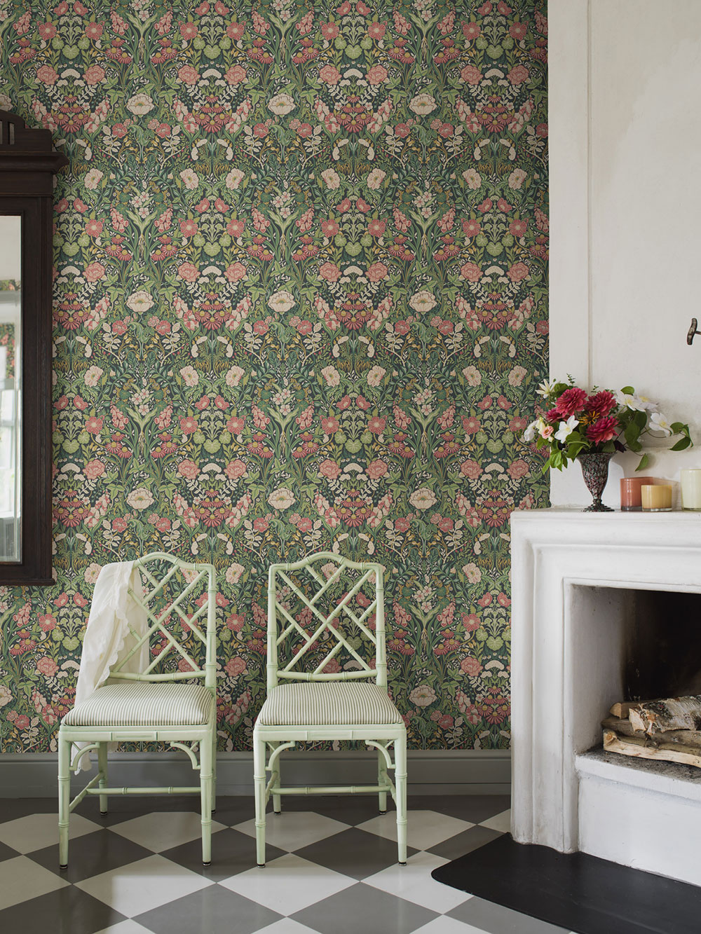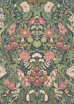 Tapete mit schwarzem Hintergrund, üppiges Blumenmuster in Grün-, Rosa- und Ockertönen.