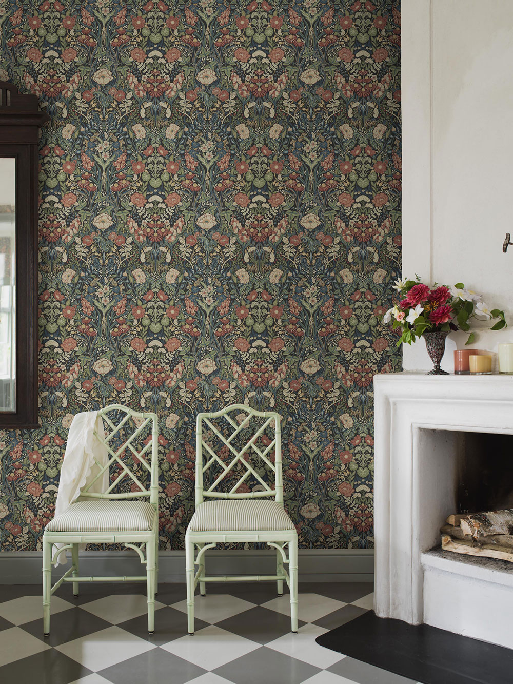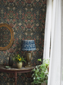 Tapete mit schwarzem Hintergrund, üppiges Blumenmuster in Grün-, Blau-, Weinrot-, Ocker- und Beigetönen.