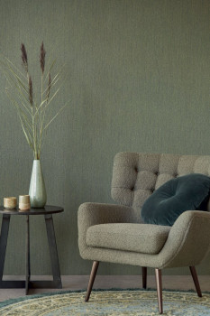 Vliestapete mit feinplastischer Oberfläche, gestromtes Blasendesign in Flaschengrüntönen.