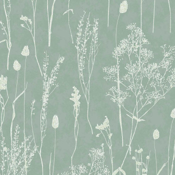 Vliestapete mit feinplastischer Oberfläche, Wiesenpflanzenmotiv in Weiß-/Blassgrüntönen, türkisfarbener Hintergrund.