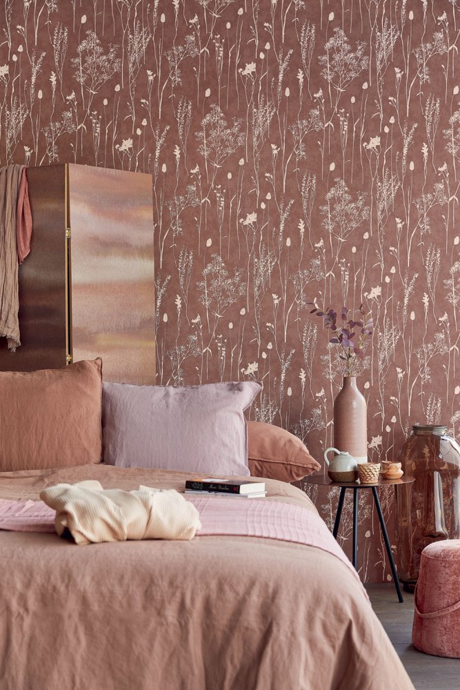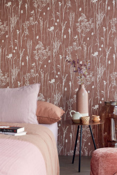 Vliestapete mit feinplastischer Oberfläche, Wiesenpflanzenmotiv in Weiß-/Altrosatönen, Terrakotta Hintergrund.
