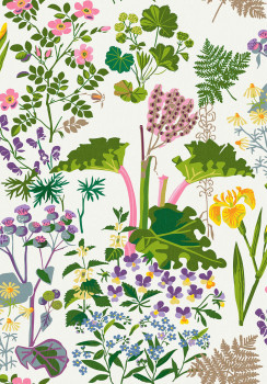Vliestapete mit floralen und blattartigen Motiven in Grün-, Blau-, Rosa- und Lilatönen auf weißem Hintergrund.