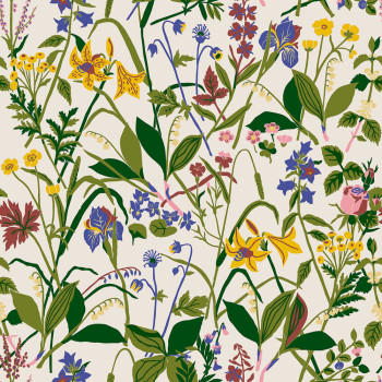 Vliestapete mit buntem Blumenmuster in Grün-, Knallblau-, Gelb-, Rosa- und Weinrottönen auf cremeweißem Hintergrund.
