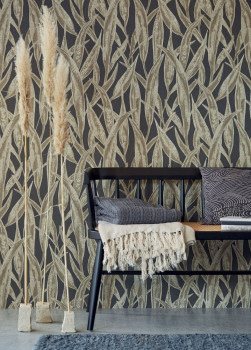 Vliestapete mit feinplastischer Oberfläche, Design von Grasblättern in Braun-Beige-Tönen auf schwarzem Hintergrund.