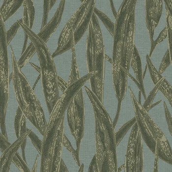Vliestapete mit feinplastischer Oberfläche, Design von Grasblättern in Flaschengrüntönen auf graugrünem Hintergrund.