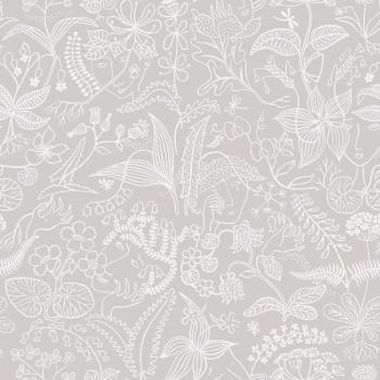 Vliestapete mit stilvollem und verspieltem Muster aus dem Archiv des schwedischen Designers Stig Lindberg – weiße Umrisse von Blumen, Blättern und Gesichtern auf grauem Hintergrund.