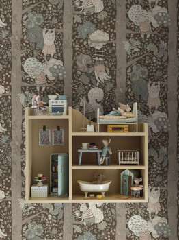 Vliestapete mit verspieltem Eichhörnchen-Motiv auf Bäumen in sanften Pastellgrün-, Beige- und Brauntönen auf braunem Hintergrund.