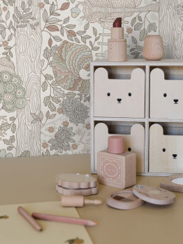 Vliestapete mit verspieltem Eichhörnchen-Motiv auf Bäumen in sanften Pastellgrün-, Beige- und Brauntönen auf cremefarbenem Hintergrund.