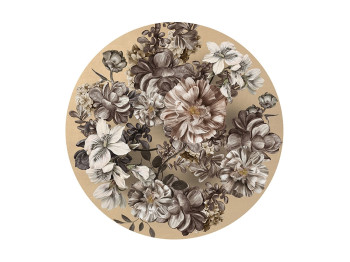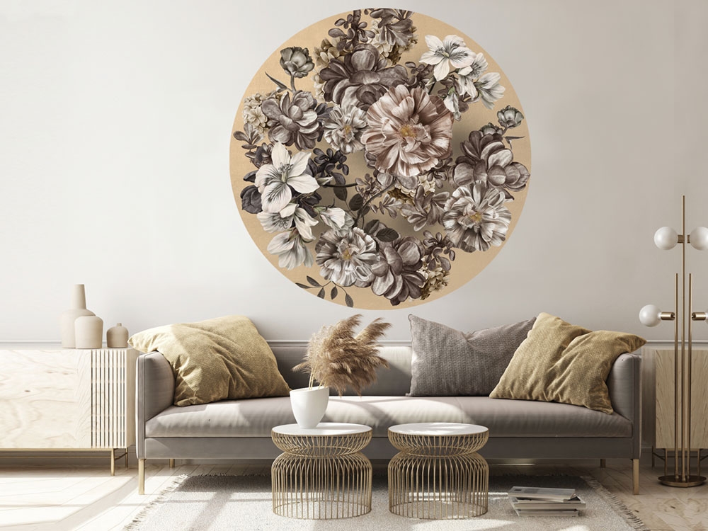 Kreisförmige Vliestapete mit Blumen auf braunem Hintergrund.