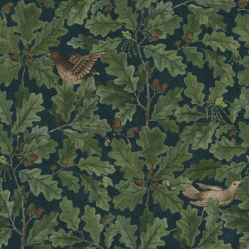 Vliestapete „Im Eichenwald“ mit mitternachtsblauem Hintergrund und frischem dunkelgrünem Design – Aquarellmuster aus Eichenblättern, zarten Eicheln und Vögeln bringt den Zauber des Waldes in Ihr Zuhause.