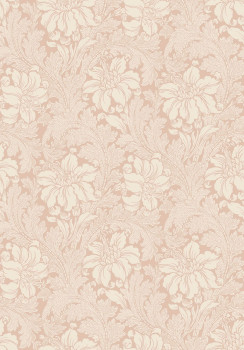 Vliestapete mit floralen und blattartigen Details in Beigetönen auf rosafarbenem Hintergrund – nach einem Entwurf aus den 1840er Jahren.