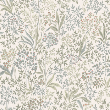 Vliestapete mit Blumen-, Frucht- und Blättermotiven in Grüntönen auf cremefarbenem Hintergrund – inspiriert von einem Entwurf aus den 1950er Jahren.