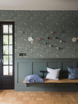 Vliestapete mit Blumen-, Frucht- und Blättermotiven in Grüntönen und feinen goldenen Details – inspiriert von einem Entwurf aus den 1950er Jahren.