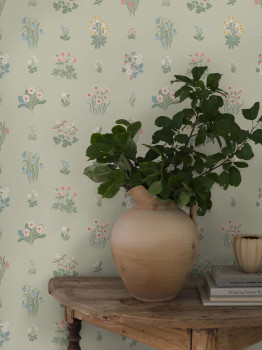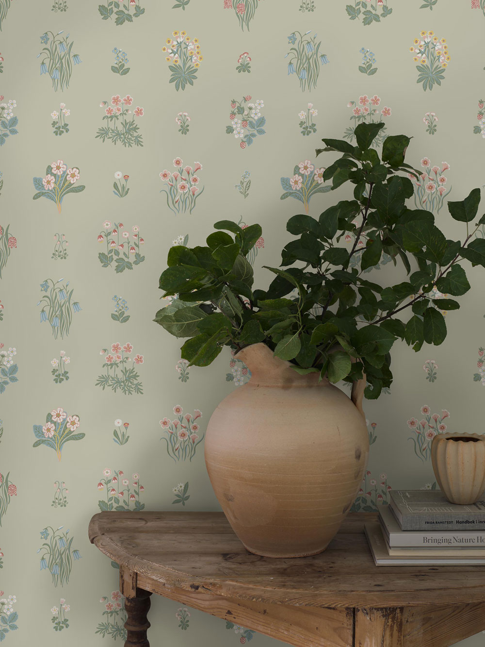 Tapete mit hellgrünem Hintergrund, handgemaltes Blumenmuster.