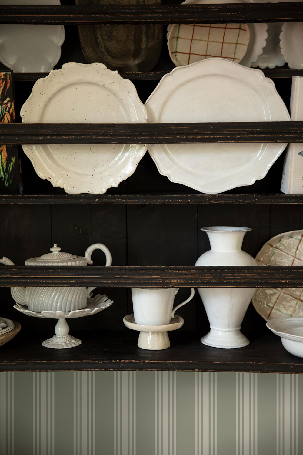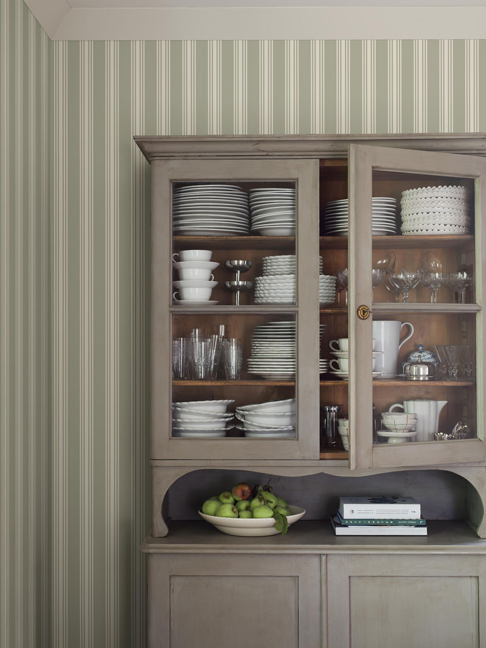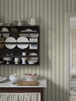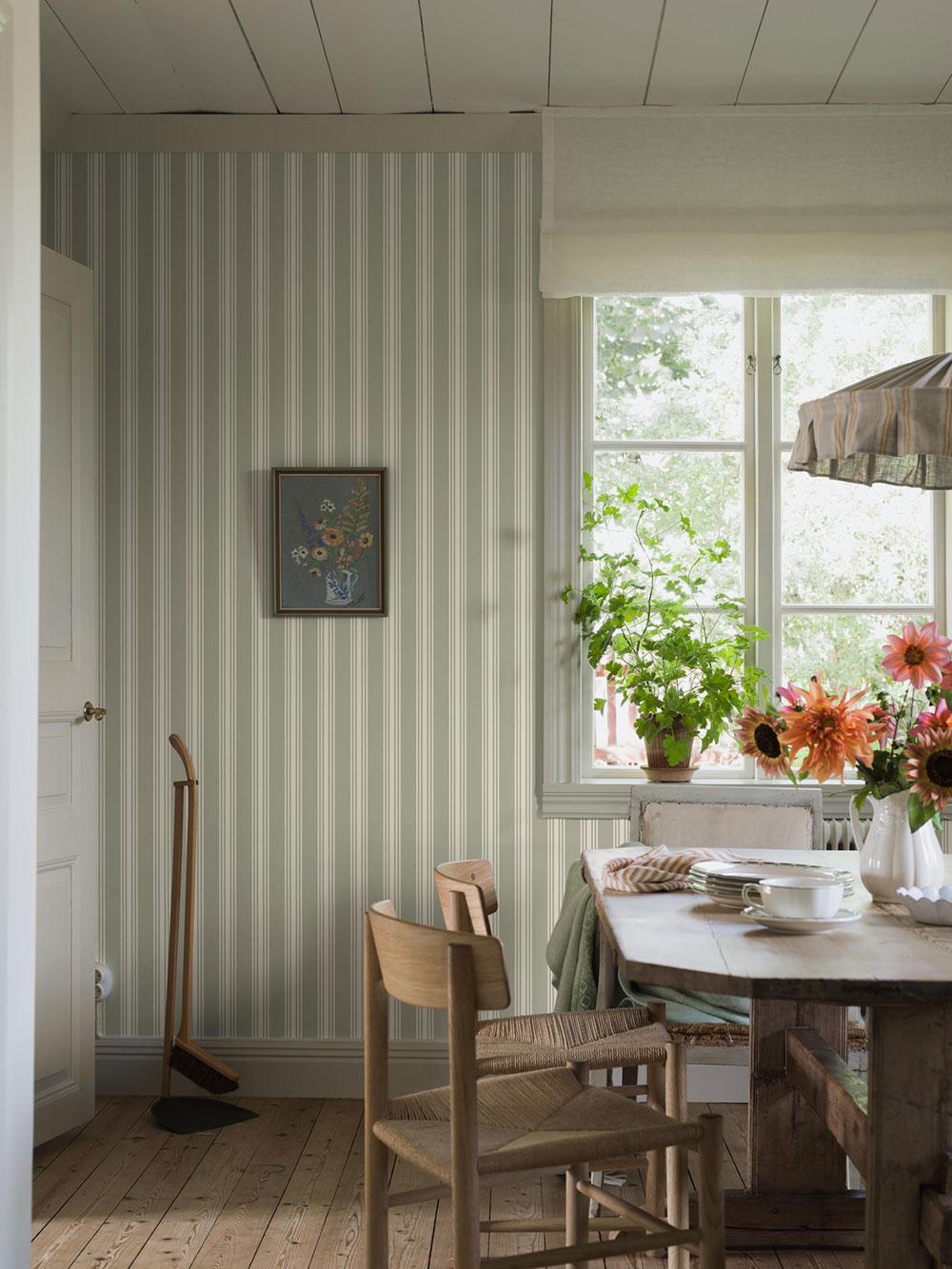 Tapete mit klassischem Streifenmuster in Lindgrün- und Cremetönen.