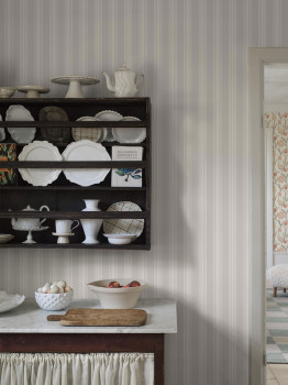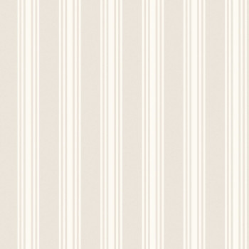 Tapete mit klassischem Streifenmuster in Cremeweiß- und Grautönen.