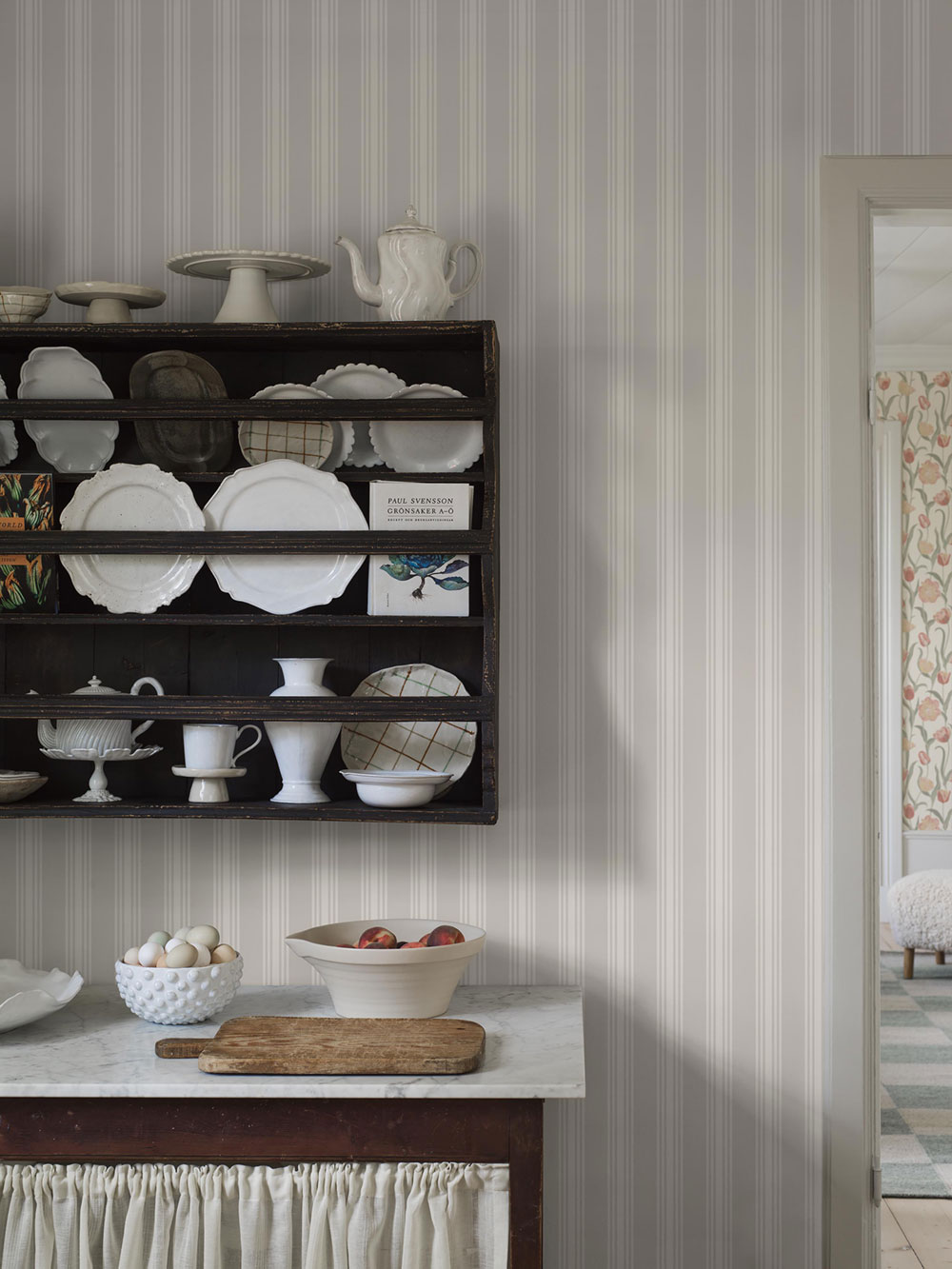 Die Tapetenkollektion Österlen bringt die Leichtigkeit und Ruhe des schwedischen Sommers in Ihr Zuhause. Handgemalte Blumen, feine Streifen und weitere Muster in zarten Pudertönen schaffen eine natürliche, sanfte Ausstrahlung. Ideal für das Ferienhaus, das Mädchenzimmer, den Flur oder das Wohnzimmer – überall dort, wo eine ruhige und freundliche Atmosphäre entstehen soll.