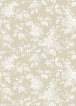 Tapete mit hellbeigem Hintergrund, Fliederzweige und Rosen in Grau-Weißtönen.
