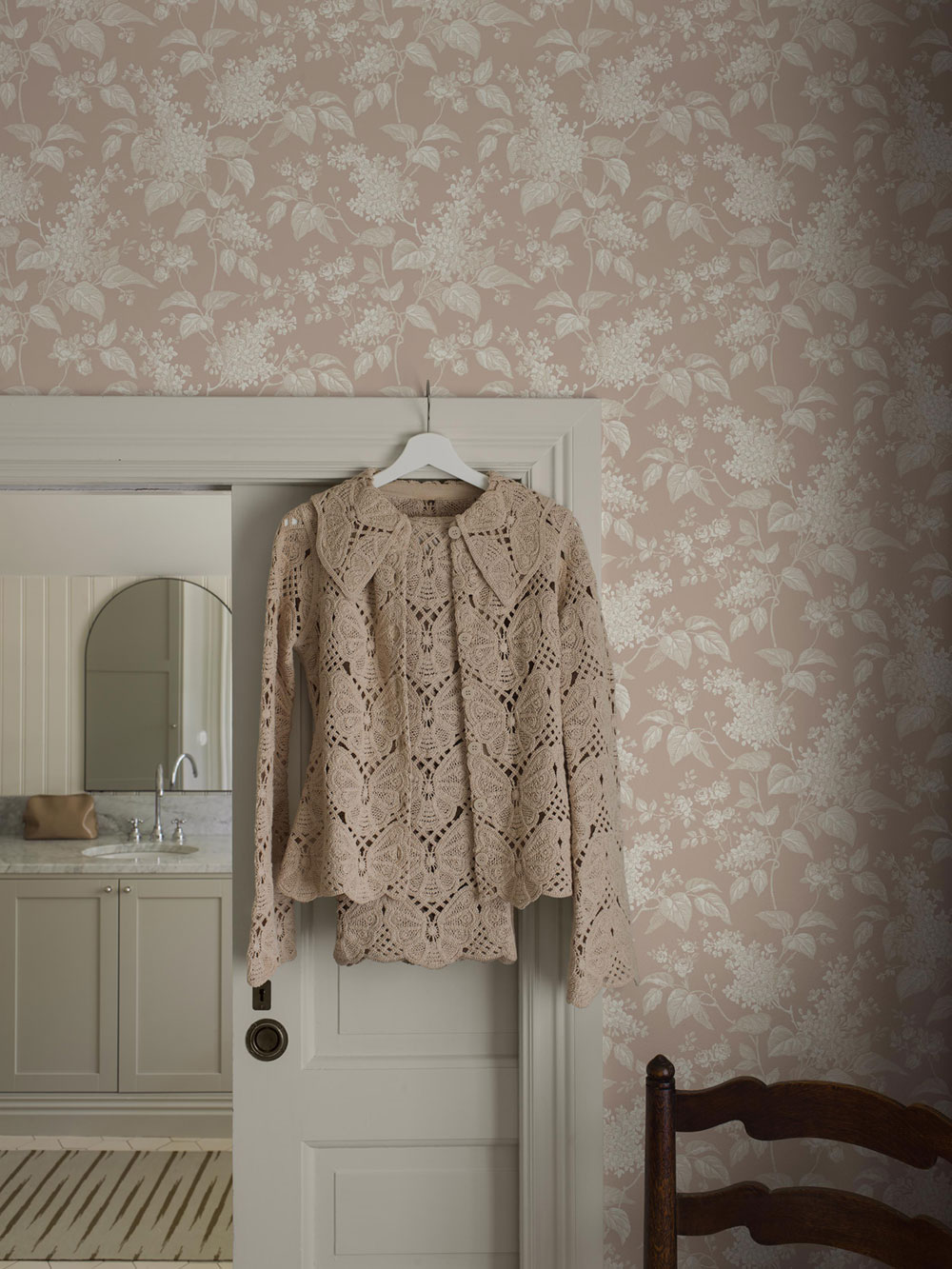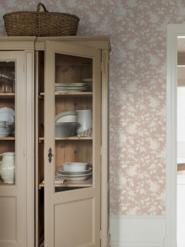 Tapete mit rosafarbenem Hintergrund, Fliederzweige und Rosen in Beige- und Weißtönen.