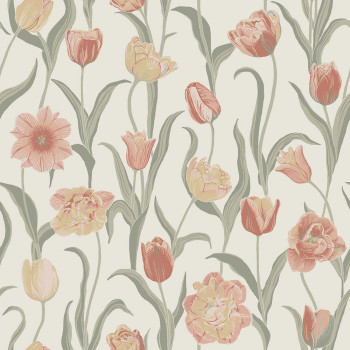 Tapete mit beigem Hintergrund, Tulpen in Grün- und Rosatönen.
