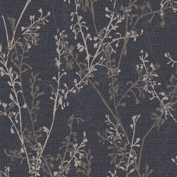 Vliestapete mit dunkelblauer Stoffstruktur, geprägte Zweige in Braun, Blau und Silber.